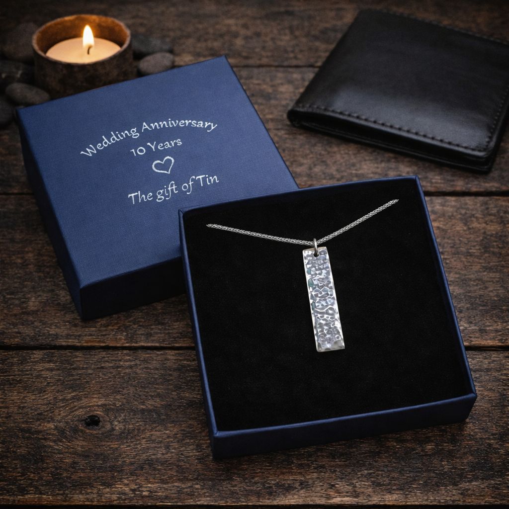 Tin is the traditional material for a 10 year anniversary gift, symbolising resilience, flexibility, and lasting love. This tin anniversary necklace for him is a wearable reminder of the journey you’ve shared over the past decade.